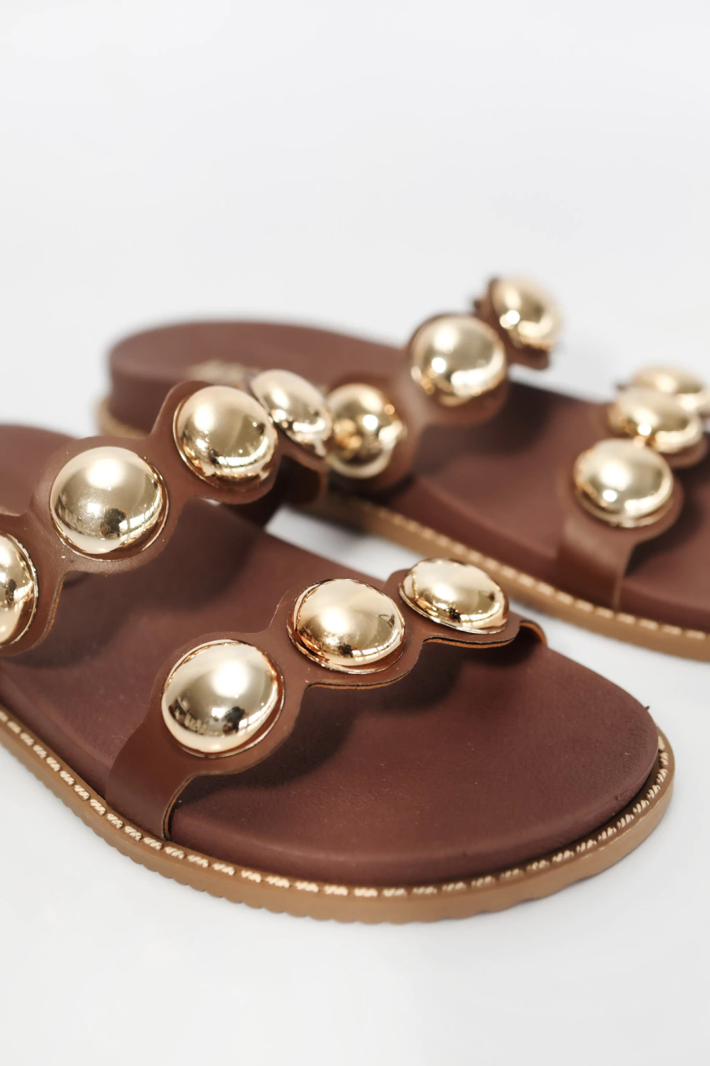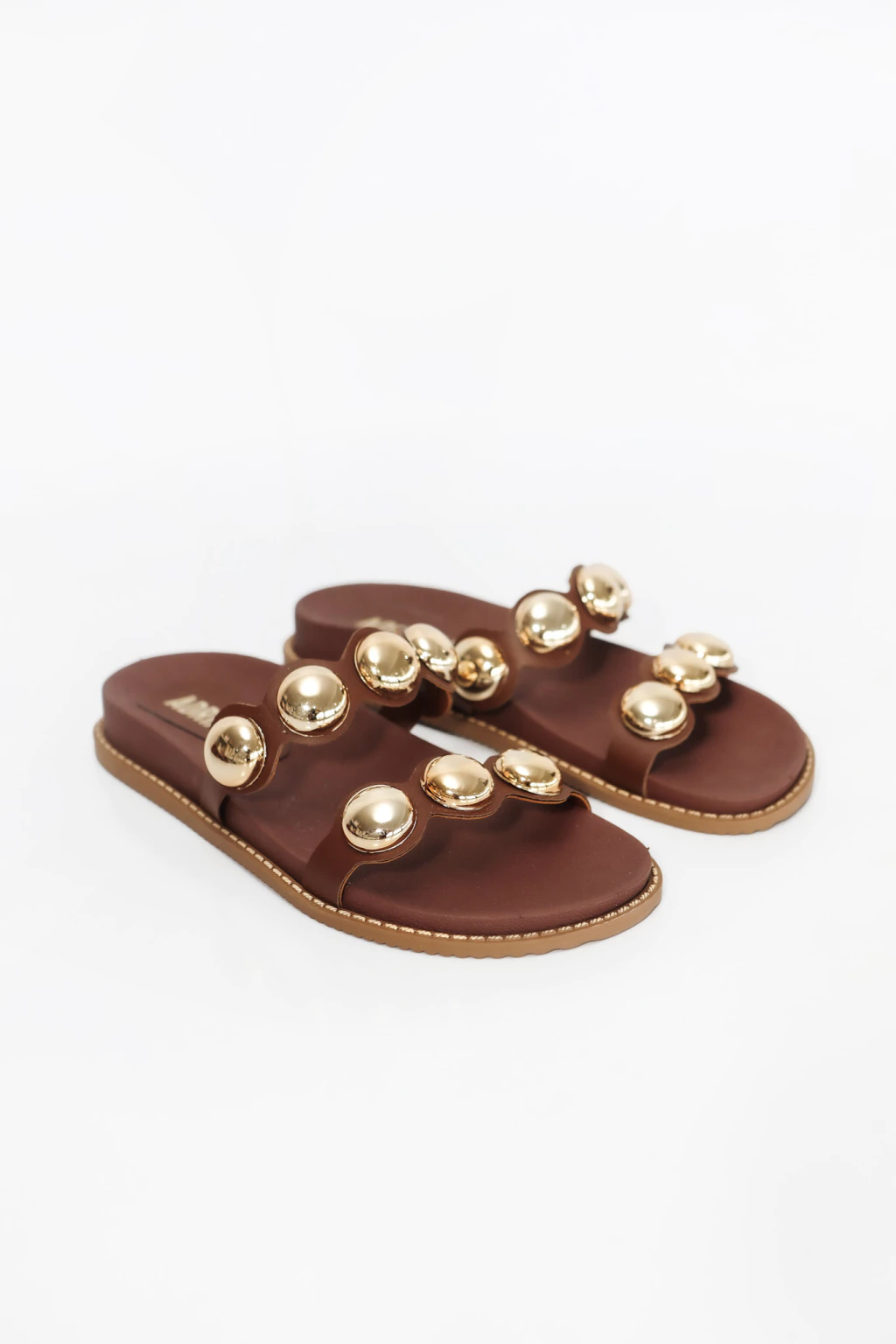 A papete Esfera Marrom é a união perfeita entre conforto e sofisticação. Seu design minimalista ganha destaque com as aplicações de esferas douradas, que adicionam um toque moderno e glamouroso ao visual. O tom marrom traz versatilidade e elegância, combinando com produções casuais ou mais elegantes.