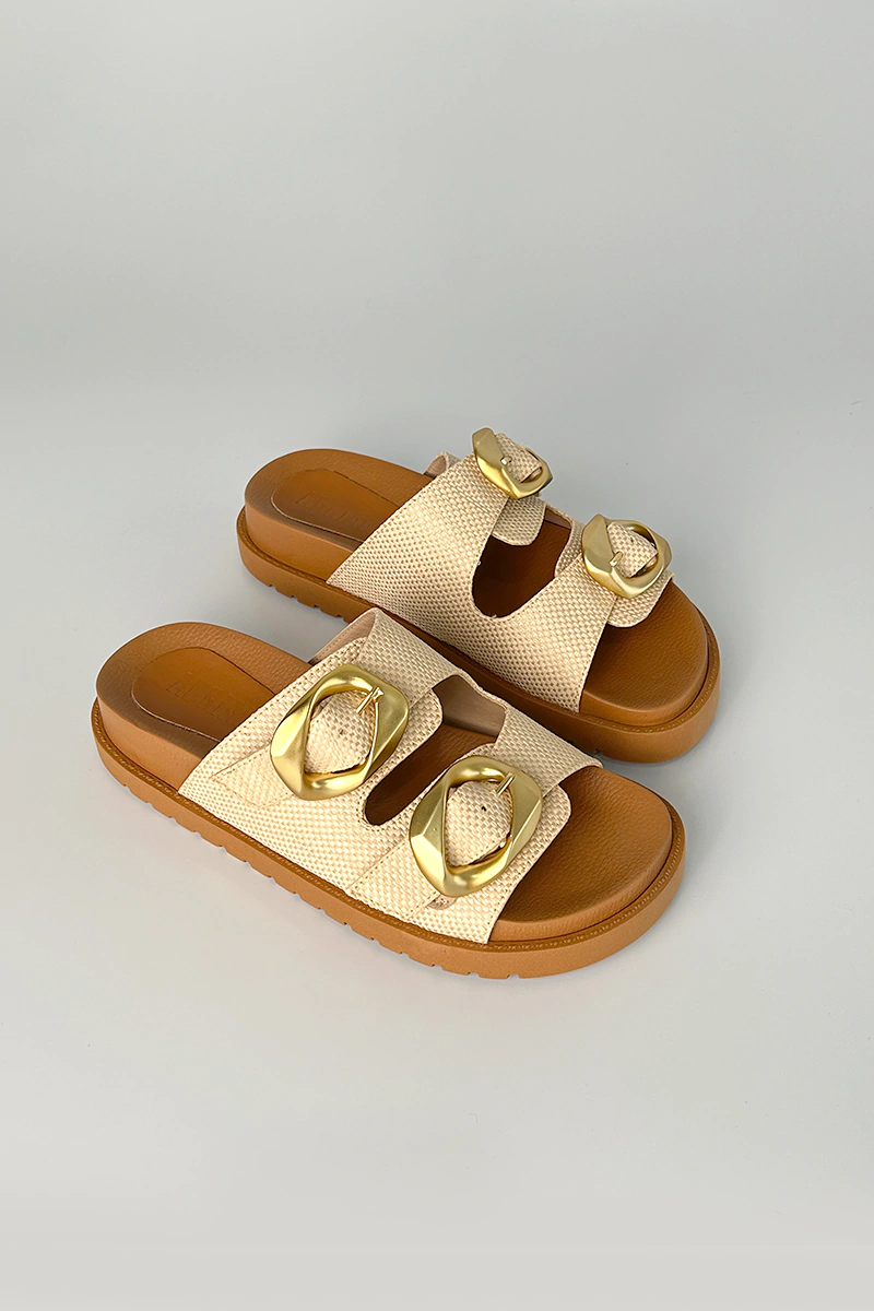 As fivelas metalizadas em dourado dão um charme especial ao design, elevando a papete de um básico confortável a um item fashion indispensável.