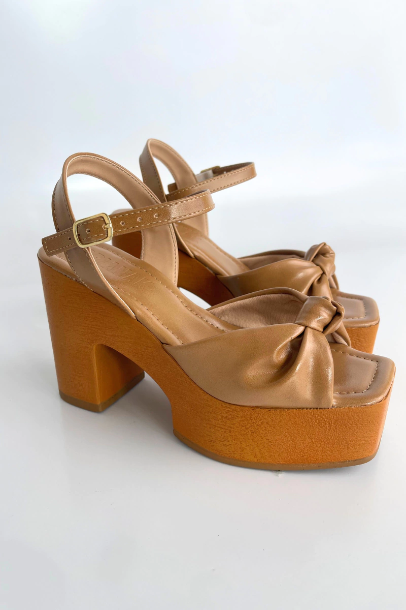 O contraste das tiras com o salto com aspecto em madeira cria um charme retrô atualizado, garantindo um visual estiloso e único.