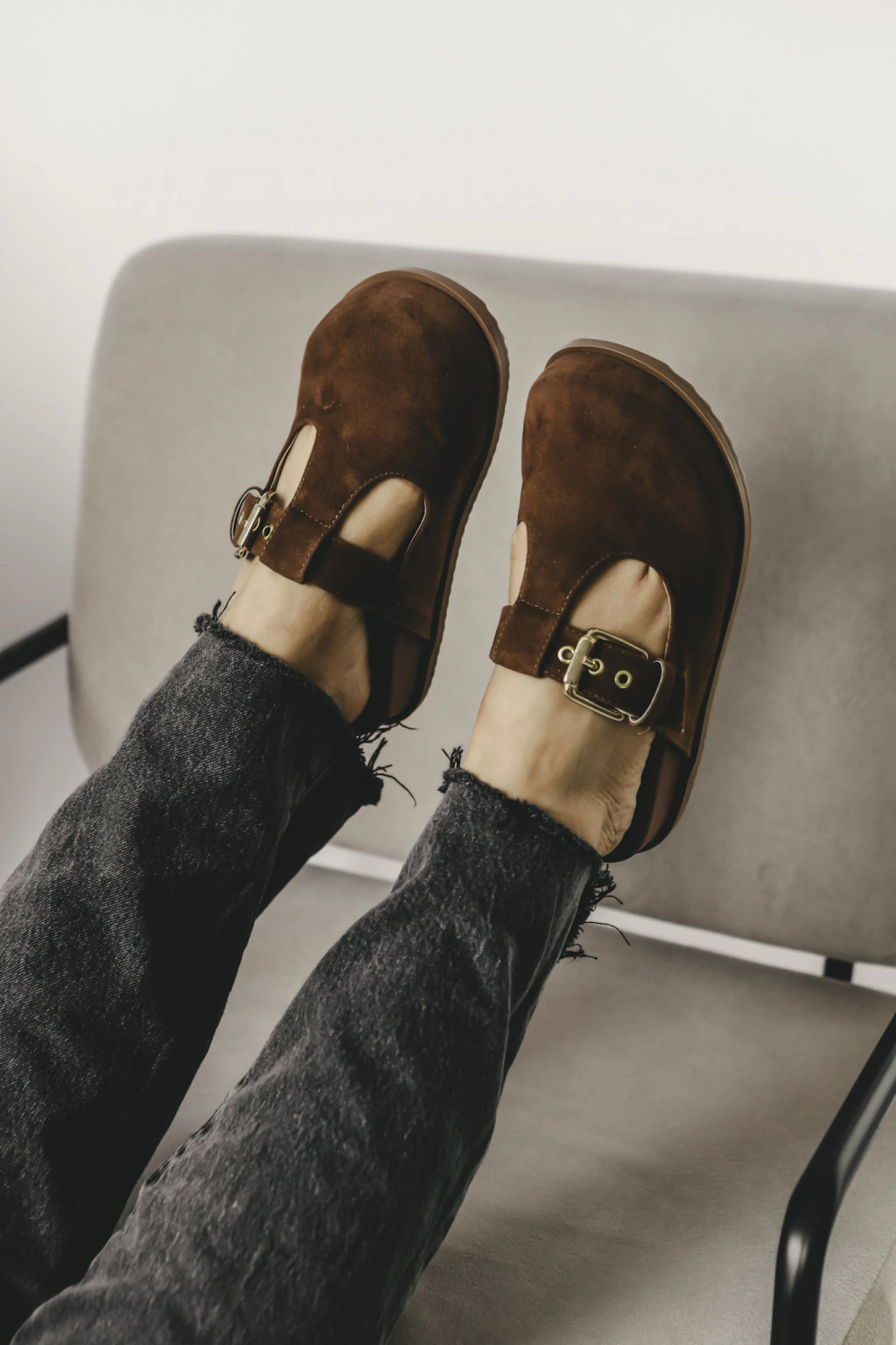 O Larissa - Clog Camurça Marrom combina um design fechado na frente com recorte lateral, criando um visual minimalista e sofisticado. A fivela lateral dourada adiciona um toque de estilo e personalidade ao modelo.
