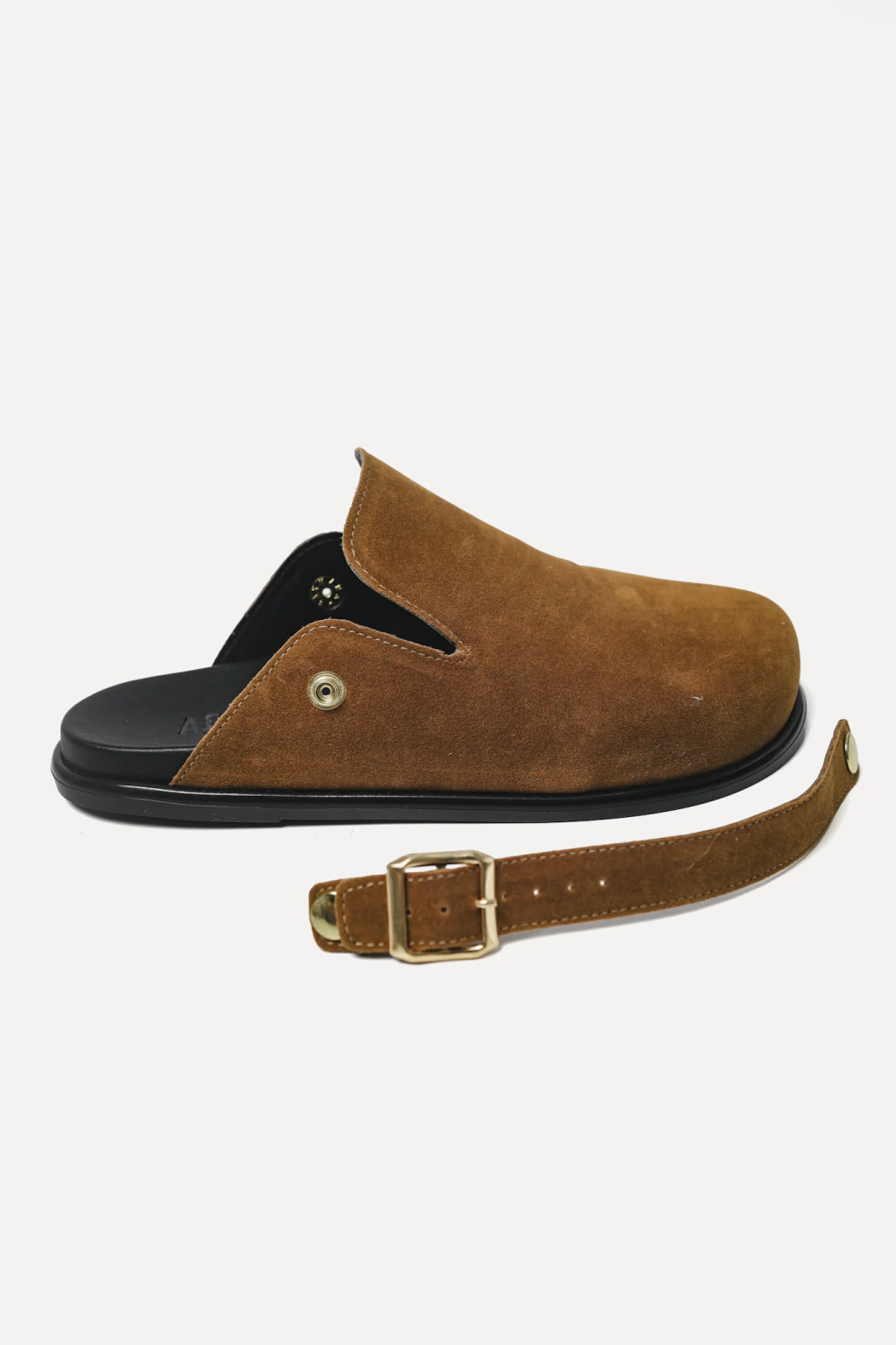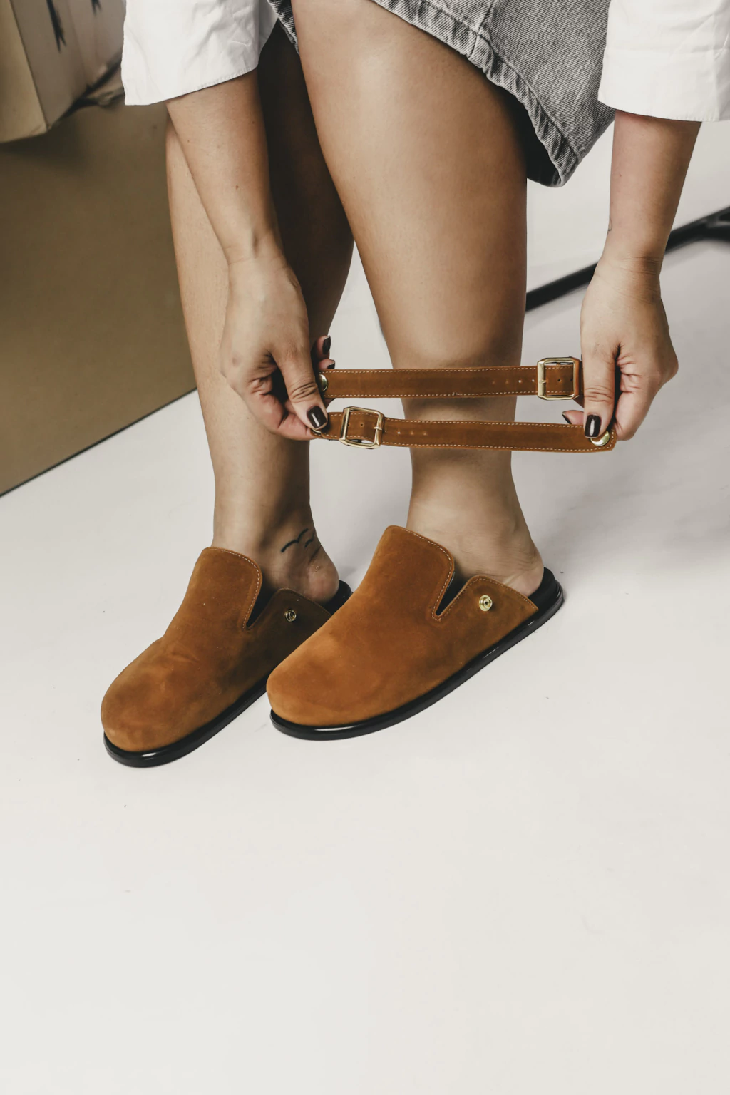 Vera – Clog 3 em 1 em Camurça Caramelo com Tira Removível